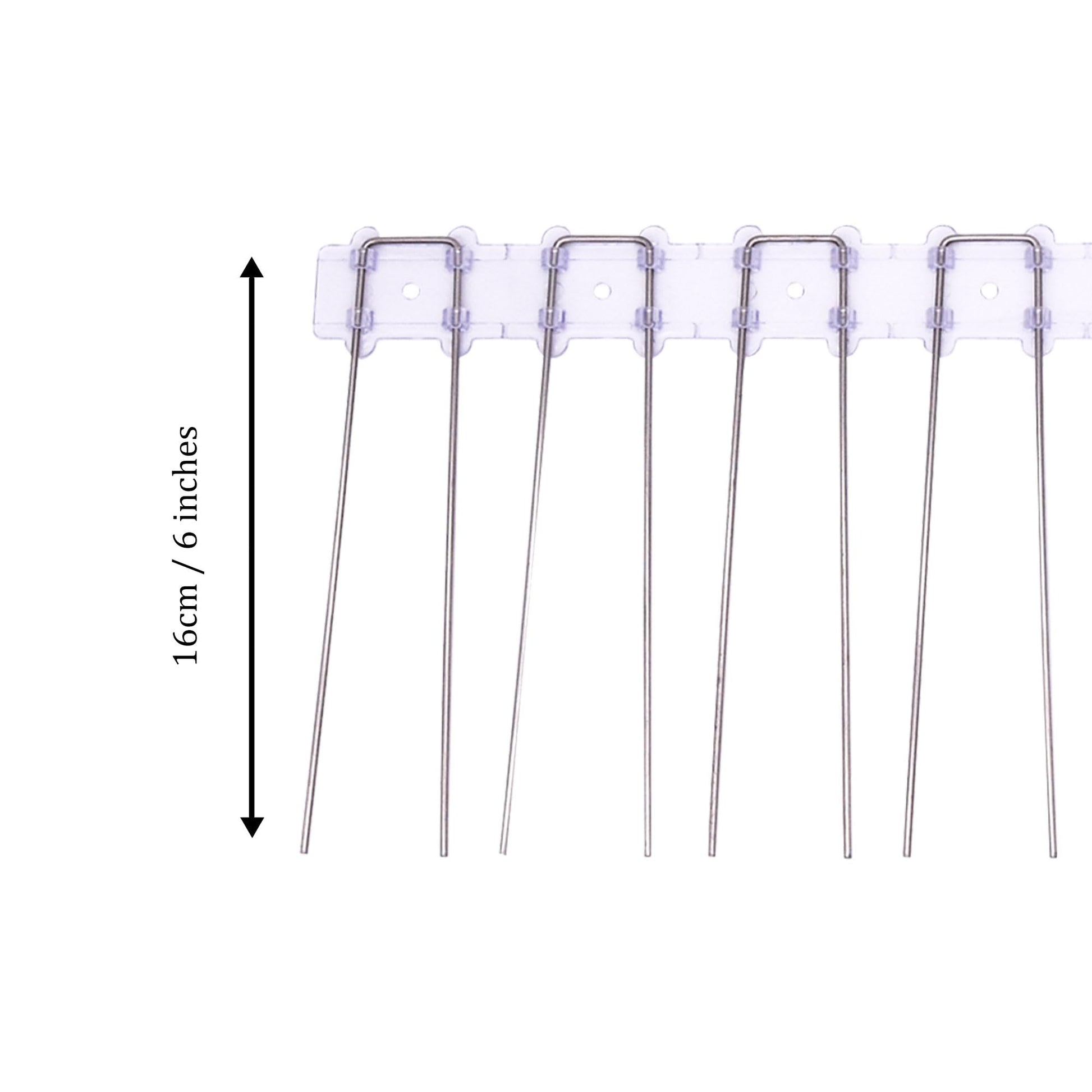 - Plastic Base: Length: 50cm/500mm | Height: 3.5cm/35mm. Each plastic base uses 10 stainless steel pins. Each spikes/pin is 16cm/160mm